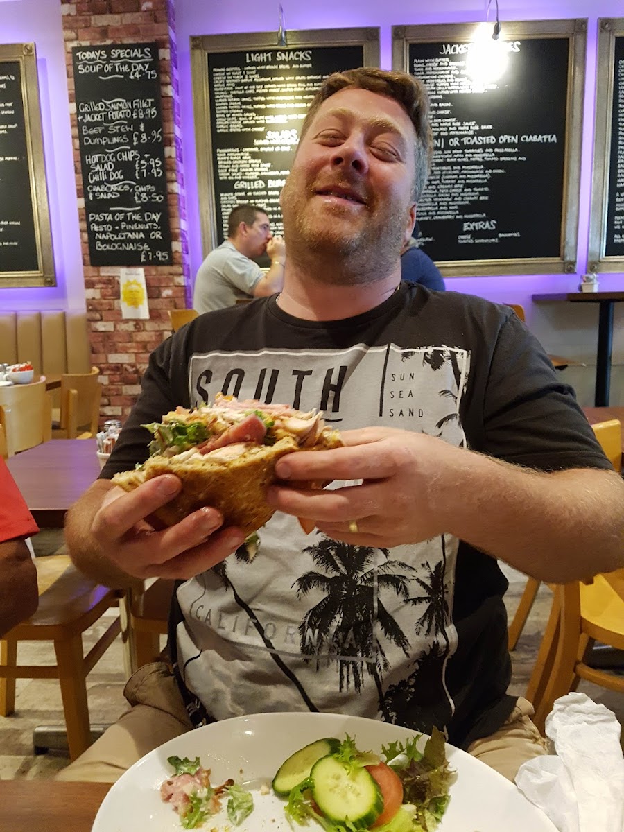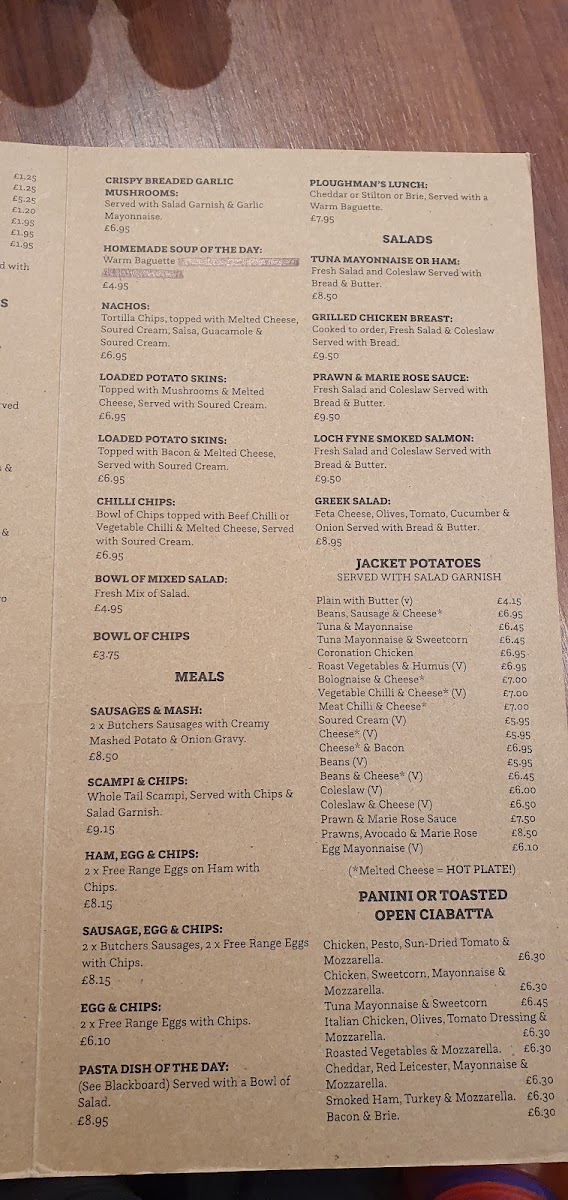 Visitors often start their day here with options like the traditional English Breakfast or lighter morning choices, pairing well with a fresh pot of tea or a rich iced mocha. For lunch, the menu features a variety of sandwiches and jacket potatoes filled with classics such as salt beef, tuna mayonnaise, or a warming vegetable chilli, fitting neatly into a casual midday break. The evening brings dishes like sausages and mash or scampi and chips — homely fare that complements the friendly, welcoming atmosphere of the cafe.